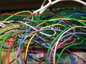 テスターで通電や音変化を確認した上で半田付けを行う。ON/OFFだけでは気づかない変化もあるので、可変抵抗を間にかませて音変化を観察する必要もある。色分けをしておくと、後日問題が発生した場合でもわかりやすい。半田付けをしっかりしないと気づくと断線していることがあるので注意が必要である。