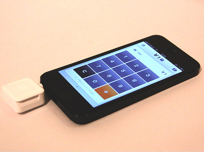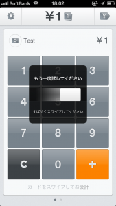 上の写真のようにイヤホン端子にSquareリーダを装着してつかいます。Squareレジ上で支払金額を入力したら後はカードを通すだけです。