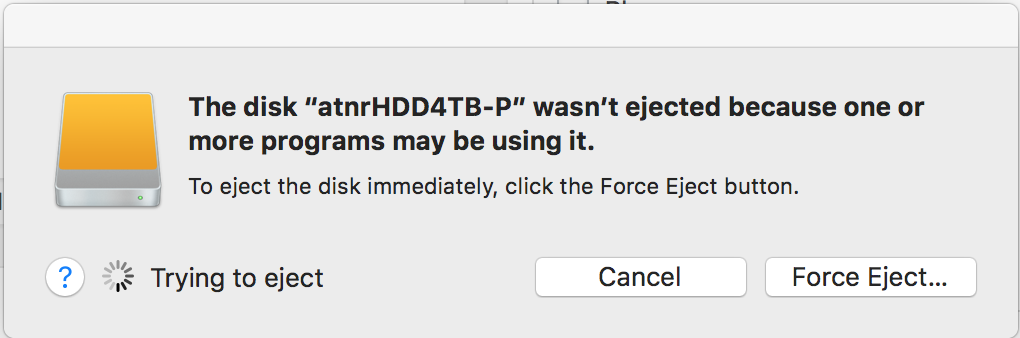 Macの外付けハードディスクをアンマウントしても1つ以上のアプリケーションが使用中というエラーが出て取り出せないことがあるので、外す方法を調べてみました。