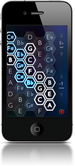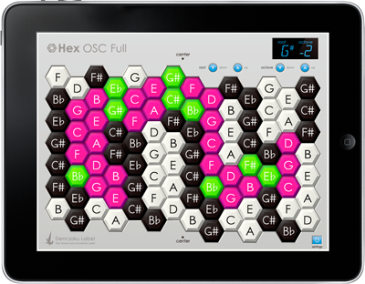 Hexシリーズは98鍵のキーを持ったiPhone / iPad / iPod touch用の音楽キーボードソフトです。 また、iPhone / iPod touchの場合は演奏中に左右にシェイクすることでキーボードを左右に移動することができます。 六角形の鍵盤同士の音程関係が常に一定なので、ギターやベースのようにパターンを覚えることで様々なキーに移調して演奏できます。