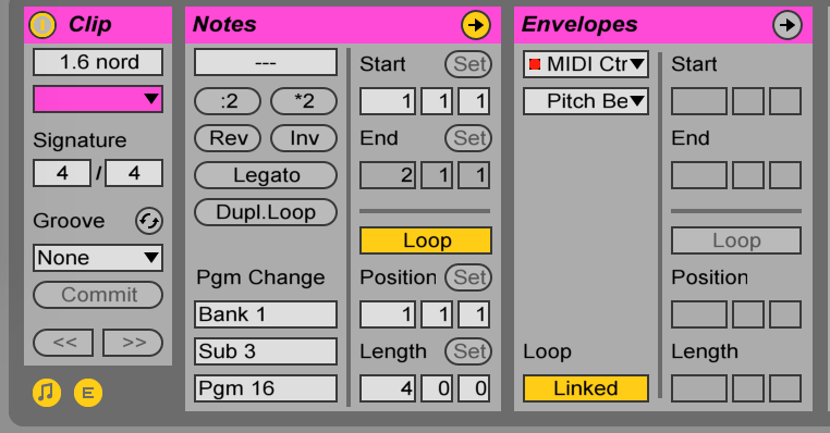以下のスクリーンショットのNotes部分にPgm Changeという項目があるのでそこを編集します。Abletonの公式にも記載があるのですが、あまり詳しく書かれていません。
