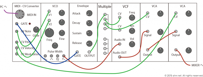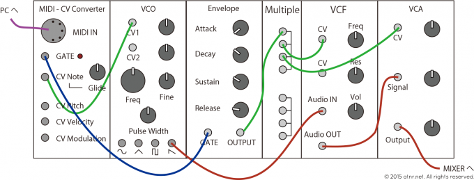 図中ではMIDI INからMIDI信号を受け取るようになっていますが、USB接続できるモジュールもあるので、使用用途に応じて適切なものを選択してください。