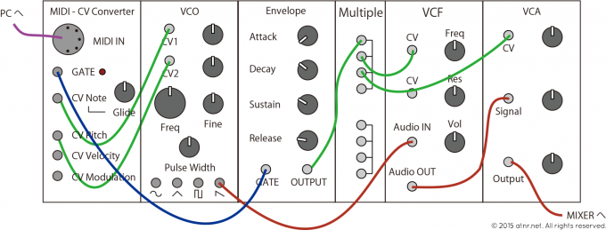 次に実際に、MIDI-CVコンバーターを使用した接続例を紹介します。
