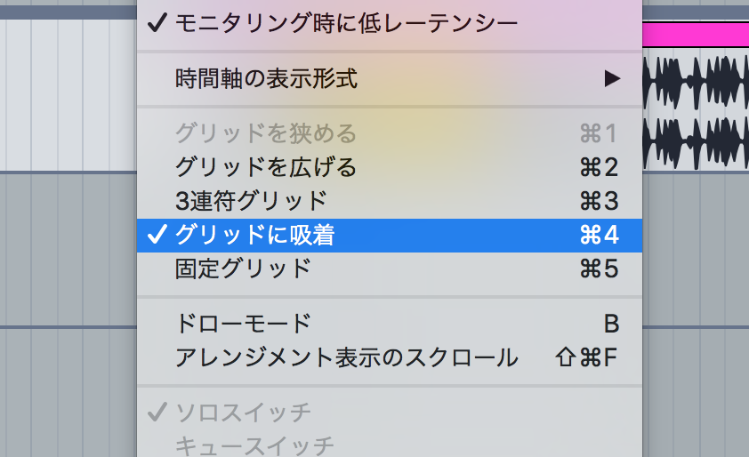 アレンジメントビューの状態でメニューからオプション > グリッドに吸着でグリッドに吸着するかどうかの設定ができます。 オプションを外すと以下のようにグリッドの線が薄くなり自由な長さでオーディオやMIDIを編集できるようになります。