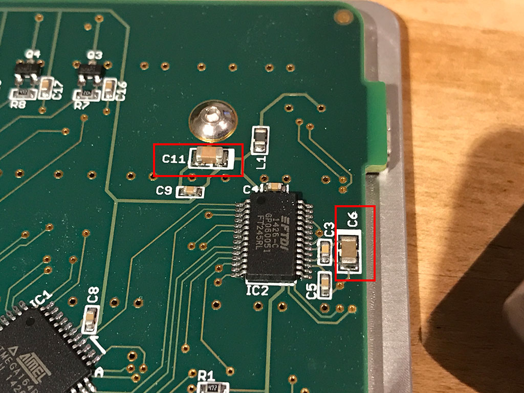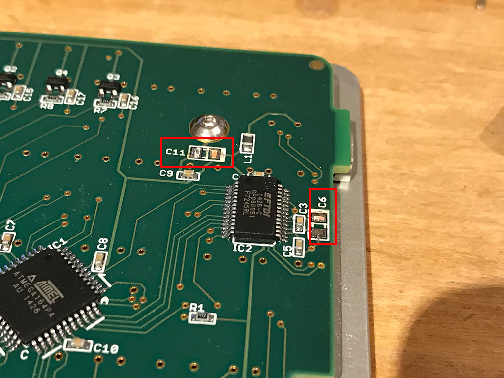 下図赤枠の部分が交換対象のコンデンサです。C11 : 10uF とC6: 4.7uFを交換します。