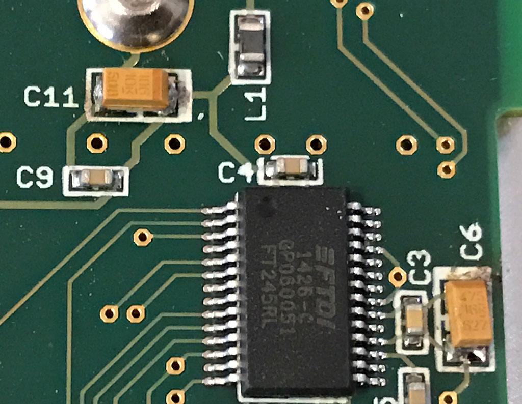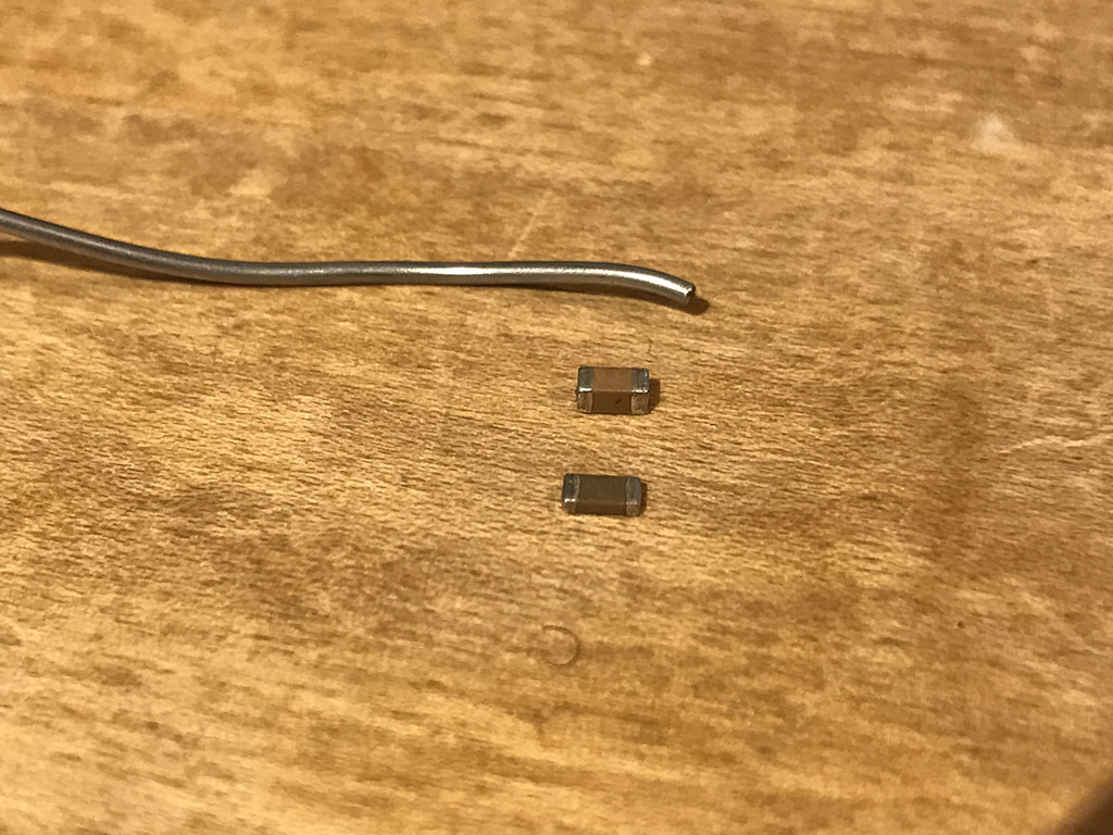 あらかじめ、チップコンデンサに半田をごく微量乗せて溶かしてくっつけてから、ニッパーでチップコンデンサを掴みながら、該当部に半田付けしました。チップの+-の間隔が狭いので半田が繋がらないように注意しましょう。