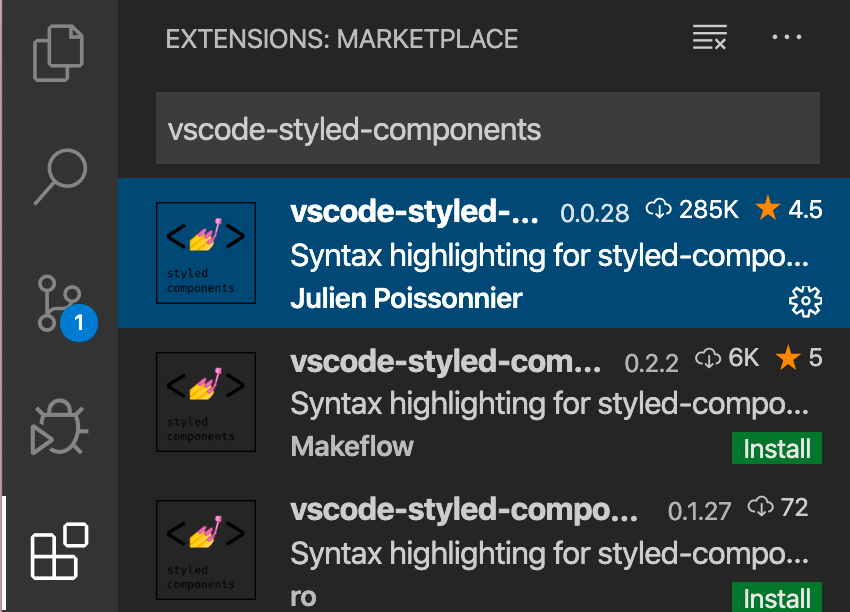 vscode-styled-componentsをインストールします。VS Codeのエクステンショの追加タブから追加できます。
