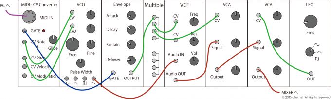 これは、パソコンのDAWソフトやMIDI機器からモジュラーシンセを制御することを想定したセッティングです。※パソコンのDAWソフトとの基本的な接続がわからないという方はまずこちらをご覧ください。