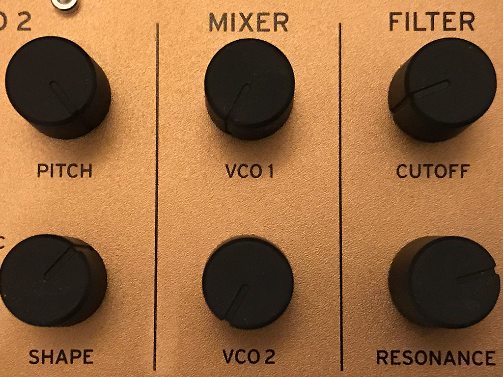 DRIVE、VCO1 VCO2のミキサーのボリュームをそれぞれ0にします。フィルターはCUTOFFを全開、RESONANCEは0にします。またEGとLFOのINTも0にします。