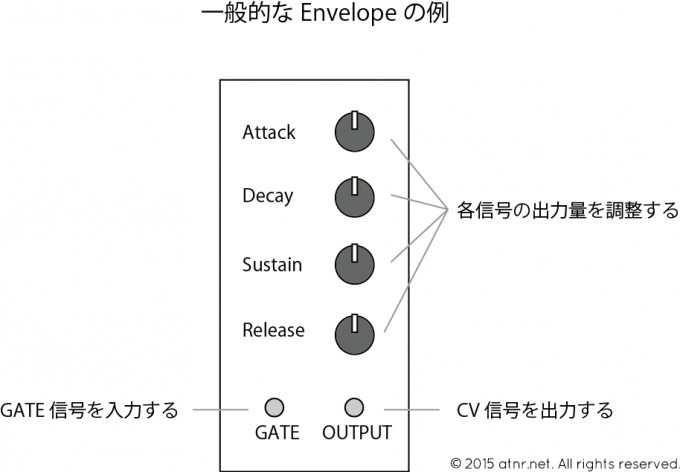Attack,Decay,Sustain,Releaseの信号量を制御するためのツマミが付いています。