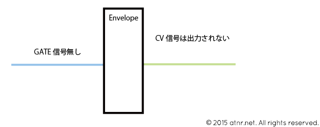 最初、GATE信号を受けていないときは、なにも信号を出力しませんが、GATE信号を受けると、CV信号を出力します。