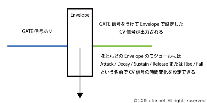 まず、前提として、エンベロープはGATE信号を受けると、なんらかのCV信号を出力するモジュールだと覚えてください。