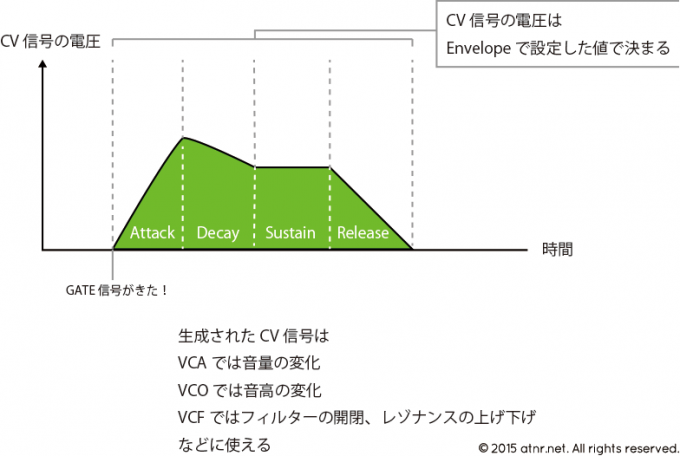 GATE信号が送られてくると、Attack,Decay,Releaseで設定した時間分、CV信号を出力します。