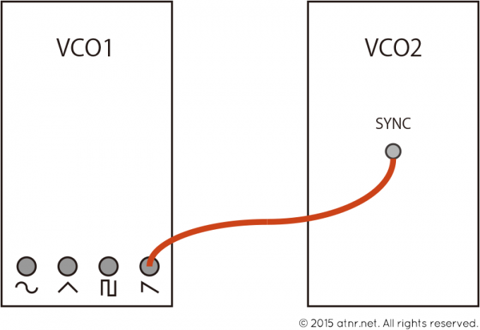 これにより、VCO1の音高(ピッチ)とVCO2の音高が同期(=同じになる)し、また、VCO1の音高に応じて、VCO2から出力される波形も変化します。つまり、音色に変化を与えることができます。