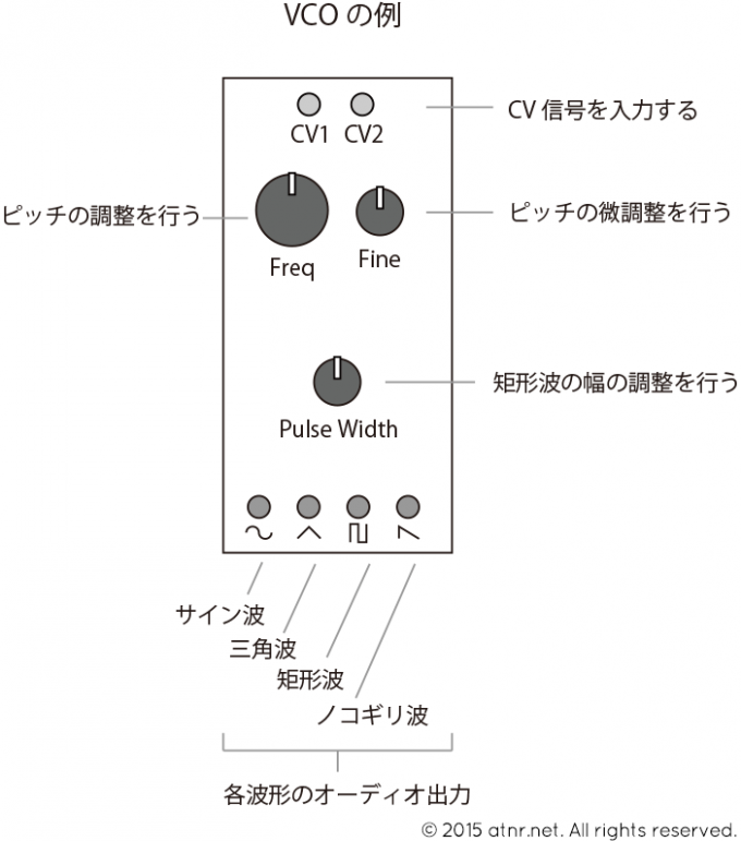 VCOは、一般的にオシレーターと呼ばれ、シンセサイザーの音の元となる波形を出力するモジュールです。ここでまず覚えておいていただきたいことは、基本的にVCOは電源が入っている間中、音が出っぱなしになっているということです。