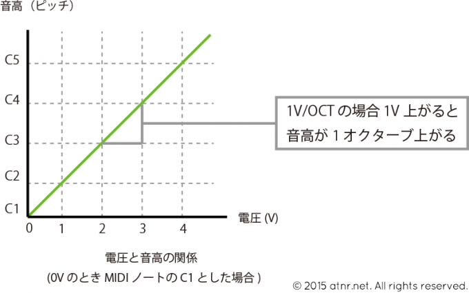 一般的なモジュラーシンセのVCOは1V(1ボルト)ごとに1オクターブ音が高くなるV/OCT(ボルトオクターブ)方式で音高を制御する仕組みとなっています。