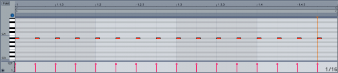 A190-3とPCをUSBまたはMIDIケーブルで接続して、AbletonのMIDIトラックで16分ごとにノートONするような、以下のようなループを作ります。
