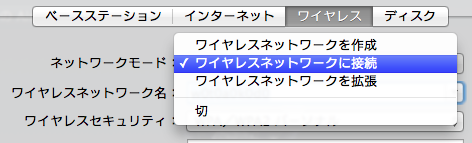AirMacユーティリティ 6.1のネットワークモードの項目で「ワイヤレスネットワークへ接続」がなくなり、「ワイヤレスネットワークを作成」と「ワイヤレスネットワークを拡張」の2つしか選択出来なくなってしまい戻せない。