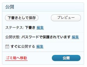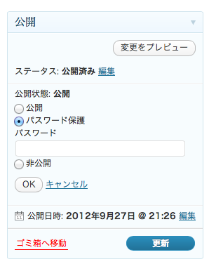 パスワードを入力して保存すると公開状態がパスワードで保護されていますに変わります。